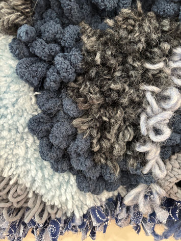 Mussel Memory is a fiber-based reflection on the tidal pools of my childhood — small, glistening worlds where my sisters and I would visit, search, and sit in wonder. Crafted from recycled fabric, lace, and yarn, this piece weaves together both material and memory. The textures echo the tangled seaweed, delicate shells, and cool saltwater, while the soft palette and layered stitches recall the quiet joy of discovery along the rocky shore.
